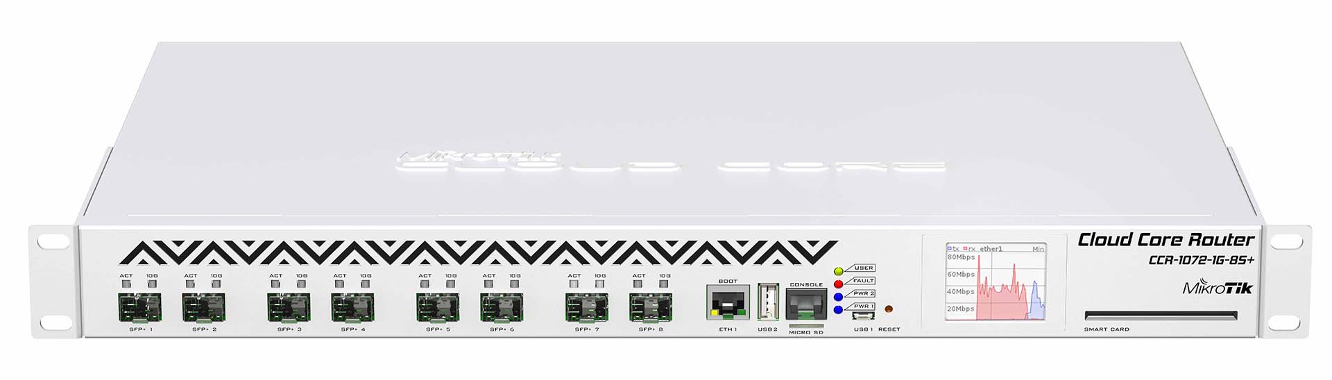 MikroTik CCR1072-1G-8S+ MikroTik CloudCoreRouter 1072, 72 çekirdekli Tilera işlemci, 16GB RAM, 8 SFP+, 1 Gigabit portu 2 adet Hot spwap destekli PSU ve RouterOS işletim sistemine sahip CCR1072-1G-8S+ özel işlemcisi sayesinde saniyede 100 milyon Paket taşıyabilmektedir.