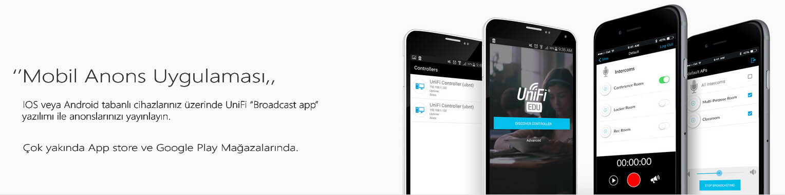 UniFi UAP AC EDU ile birlikte sunulan Anons Hoparlörünün kulurumunu ilave data veya Güç kablolaması yapmadan gerçekleştirebilir, cihazınıza çekilen PoE kablosu üzerinden cihazınızın ve kablosuz Erişim noktalarınızın yönetimini ve güç ihtiyacını karşılayabilirsiniz. Yapılacak anonsunuzu Android veya IOS platformuna sahip akıllı telefonunuz üzerinden yapabilir, dilerseniz tek bir UBNT UniFi UAP AC-EDU veya birden fazla kablosuz erişim noktanız üzerinden anons işlemini gerçekleştirebilirsiniz.