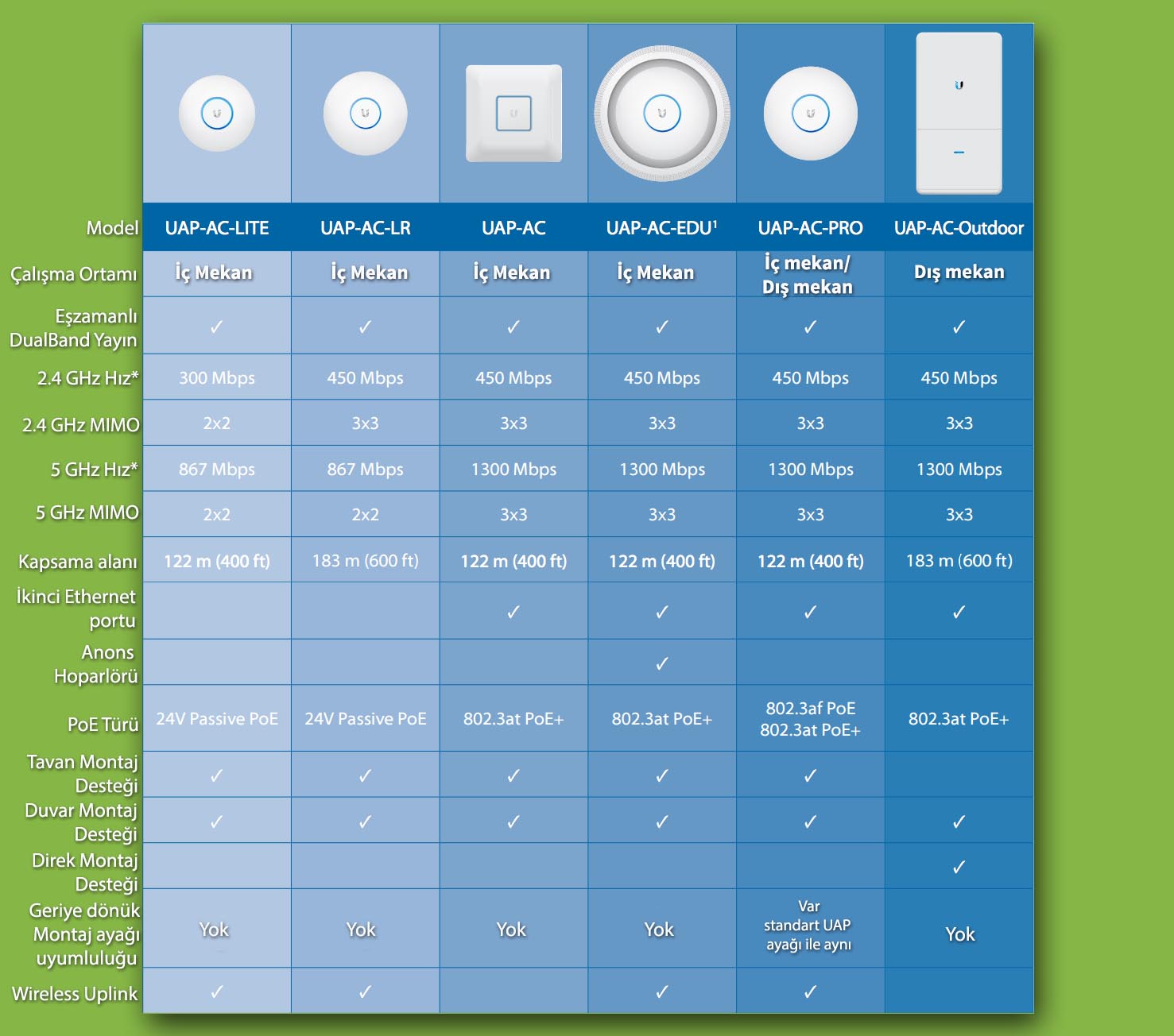 UniFi UAP AC Serisi Ürünlere Ait Karşılaştırma Tablosu için Tıklayın.